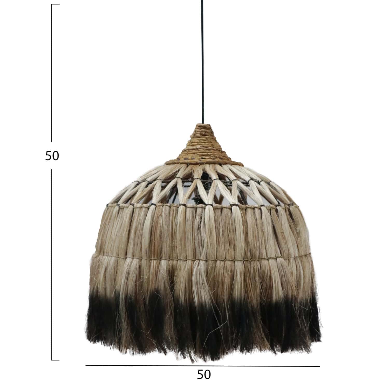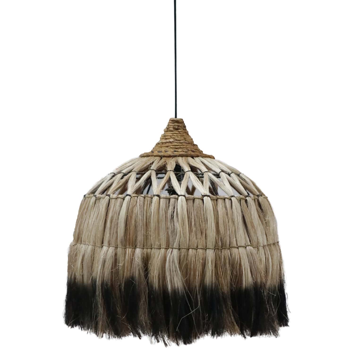 Hm7761- Kρεμαστό φωτιστικό—- Αν επιθυμείτε να διακοσμήσετε το χώρο σας με ένα φωτιστικό σε boho στυλ, αυτό είναι μια χαρακτηριστική επιλογή. Είναι ένα μονόφωτο φωτιστικό με «καπέλο» σε σχήμα καμπάνας φτιαγμένο από ίνες κάνναβης Μανίλας σε φυσικό και μαύρο χρώμα. Το ιδιαίτερο χαρακτηριστικό αυτού του φωτιστικού είναι ότι στο επάνω μέρος του καπέλου οι ίνες είναι πλεγμένες με χιαστί τρόπο δίνοντας μια άλλη αισθητική στο φωτιστικό.