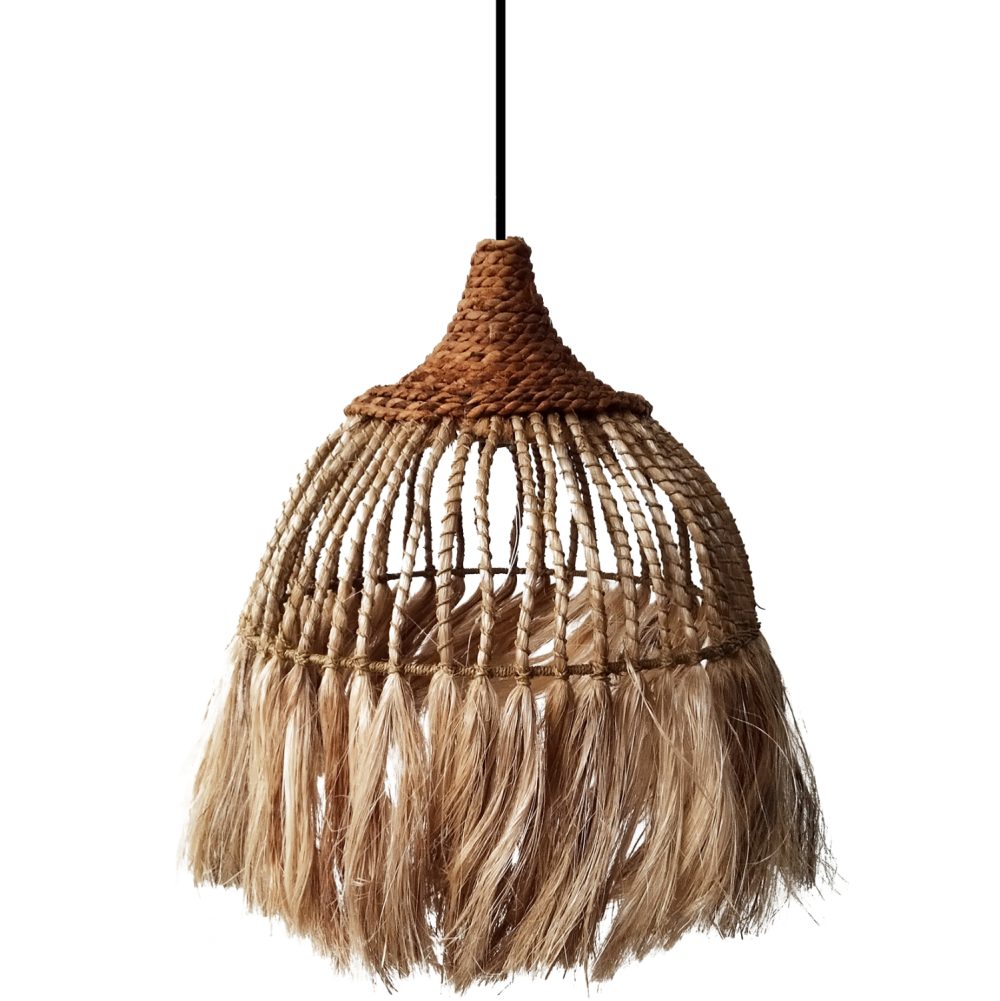 Hm7752- Kρεμαστό φωτιστικό—- Αν επιθυμείτε να διακοσμήσετε το χώρο σας με ένα φωτιστικό σε boho στυλ, αυτό είναι η πιο σωστή επιλογή. Είναι ένα μονόφωτο φωτιστικό για επαγγελματική χρήση, με «καπέλο» σε σχήμα καμπάνας φτιαγμένο από σκοινί, υψηλής ποιότητας και αντοχής στο χρόνο. Το ιδιαίτερο χαρακτηριστικό, όμως, αυτού του φωτιστικού είναι ότι το «καπέλο» καταλήγει σε κρόσια, επιτείνοντας ακόμα περισσότερο το boho στυλ.