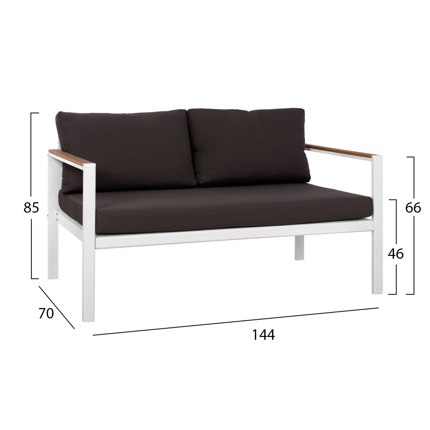 Καναπές διθέσιος με σκελετό αλουμινίου σε λευκή απόχρωση, λεπτομέρειες polywood στα μπράτσα και υφασμάτινα μαξιλάρια σε σκούρο γκρι χρώμα.