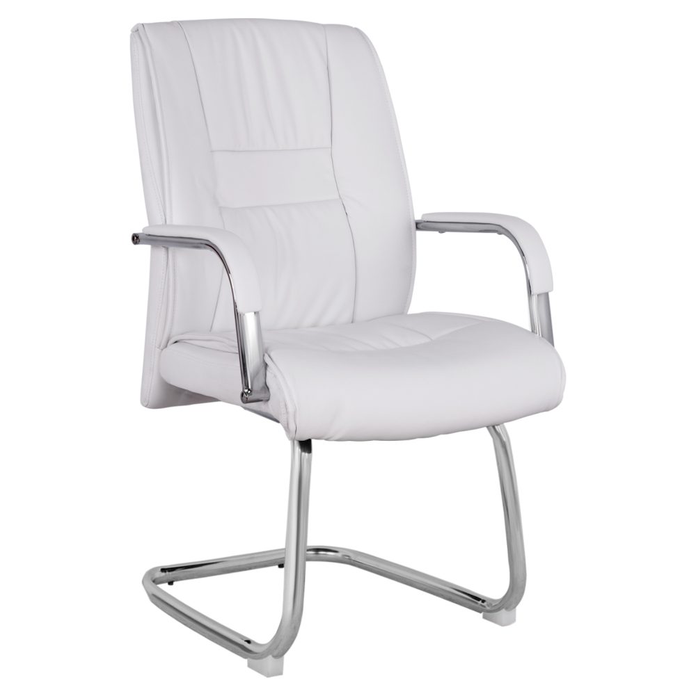 Καρέκλα συνεργασίας με μπράτσα, από υψηλής ποιότητας PU σε λευκή απόχρωση και χρωμιομένο σκελετό.