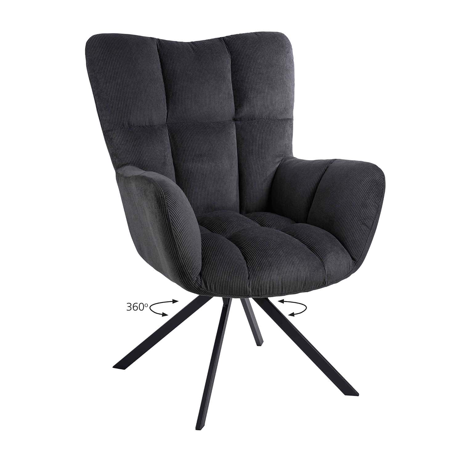 Η Hilda είναι μία πολυθρόνα που ξεχωρίζει για την αναπαυτικότητα, αλλά και την εξαιρετική της ποιότητα. Το κάθισμά της είναι επενδεδυμένο από υψηλής ποιότητας κοτλέ ύφασμα σε χρώμα Γκρι, το οποίο διακοσμείται από capitone μοτίβο σε όλη την επιφάνειά του. Η μεταλλική της βάση είναι ηλεκτροστατικής βαφής σε χρώμα Μαύρο Ματ. Επίσης διαθέτει δυνατότητα περιστροφής 360°, γεγονός που την καθιστά ιδιαίτερα εύχρηστη. Η Hilda εξοπλίζει τον χώρο σας με ομορφιά, στυλ και ποιότητα αλλά προσφέρει και στιγμές πραγματικής χαλάρωσης.