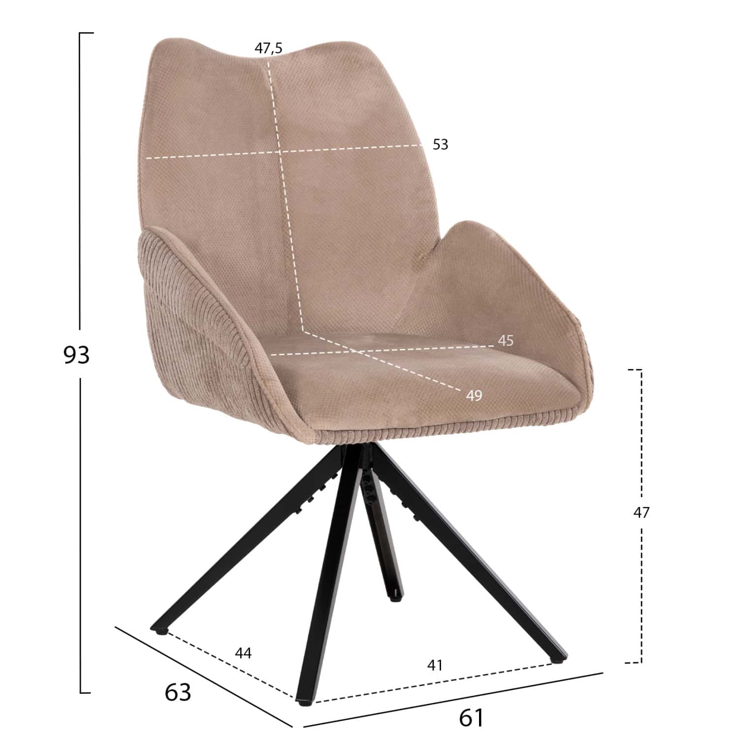 Αυτό είναι το πολυθρονάκι SHAI σε ΜΠΕΖ χρώμα με 4 μεταλλικά πόδια σε ΜΑΥΡΟ χρώμα. Η πλάτη και το κάθισμα είναι φαρδιά και αναπαυτικά ενώ το μαξιλάρι του καθίσματος δεν αφαιρείται. Τα μπράτσα είναι χαμηλά ενώ το ύφασμα που έχει διαφορετικό pattern στην εξωτερική πλευρά της πολυθρόνας, είναι υψηλής ποιότητας και δίνει μια αίσθηση πολυτέλειας. Το χαρακτηριστικό, όμως, που κάνει αυτή την πολυθρόνα να ξεχωρίζει είναι ότι τα πόδια έχουν διάταξη «αστέρι», δίνοντας την εντύπωση ότι η πολυθρόνα είναι περιστρεφόμενη.